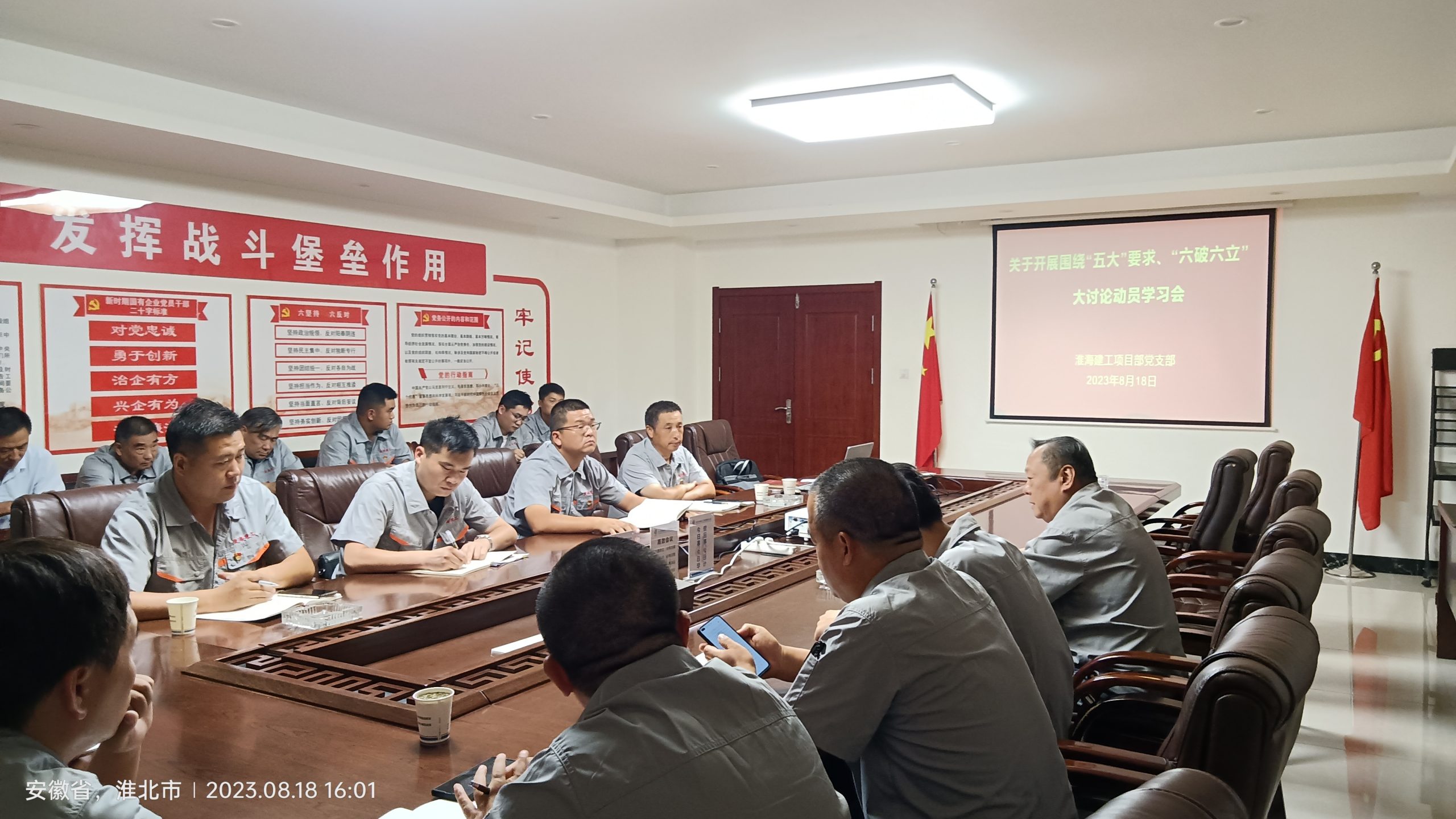 8月18日下午,淮海建工公司項(xiàng)目部黨支部召開(kāi)圍繞“五大”要求、“六破六立”大討論動(dòng)員學(xué)習(xí)會(huì),項(xiàng)目部黨支部全體黨員同志參加會(huì)議。