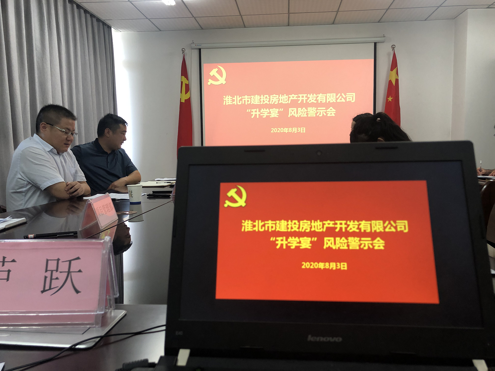 為狠剎“升學(xué)宴”等不正之風(fēng),8月3日,房地產(chǎn)公司組織召開(kāi)“升學(xué)宴”風(fēng)險(xiǎn)警示會(huì),堅(jiān)持把紀(jì)律和規(guī)矩挺在前面,劃紅線、敲警鐘,提前“亮紅燈”給“升學(xué)宴”去火降溫。