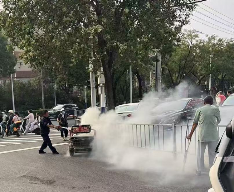 2025年6月11日上午7時(shí)41分許,淮北市保安有限公司武裝押運(yùn)一中隊(duì)W699Y車組行駛至建設(shè)銀行西城支行網(wǎng)點(diǎn)路口時(shí),突遇一輛三輪電動(dòng)車自燃,火苗從車底迅猛竄出,騎車?yán)先梭@慌失措,周邊群眾紛紛后退。時(shí)值早高峰,車流人流密集,如不及時(shí)處置,后果不堪設(shè)想。
