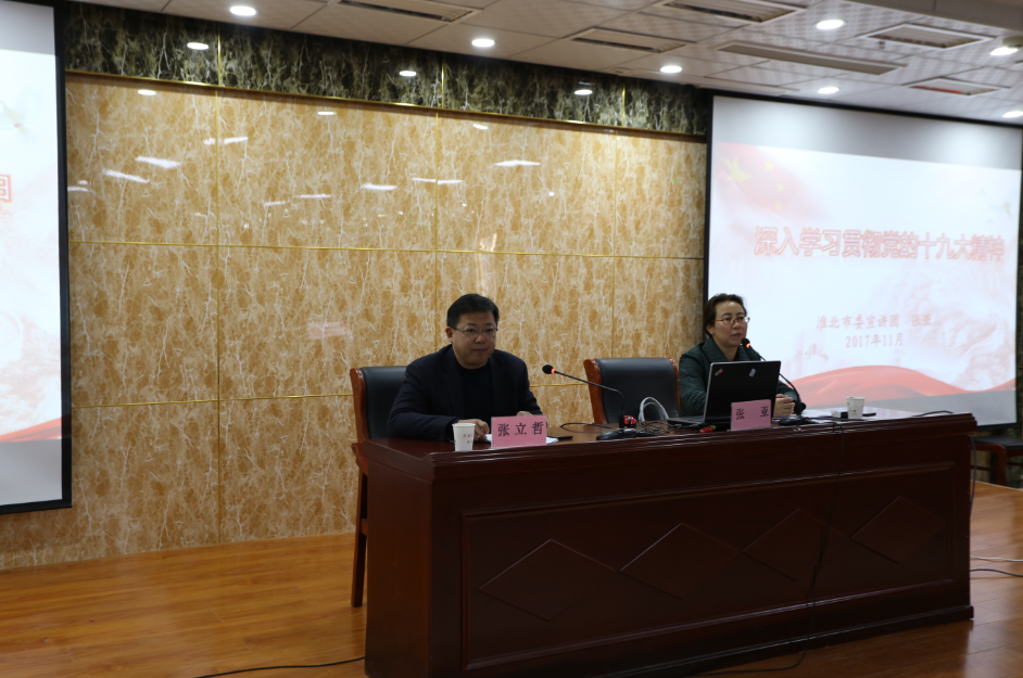 為深入學(xué)習(xí)宣傳貫徹好黨的十九大精神,幫助廣大黨員干部群眾學(xué)習(xí)好、領(lǐng)會好、落實好會議精神,11月24日上午,省委講師團(tuán)第九期“送理論進(jìn)基層”走進(jìn)淮北市建投集團(tuán)。淮北市委宣講團(tuán)成員、淮北職業(yè)技術(shù)學(xué)院黨委委員、副院長、教授、博士張亞為淮北市建投集團(tuán)廣大黨員干部宣講了黨的十九大精神,來自集團(tuán)公司的黨員干部近200人聆聽了宣講。