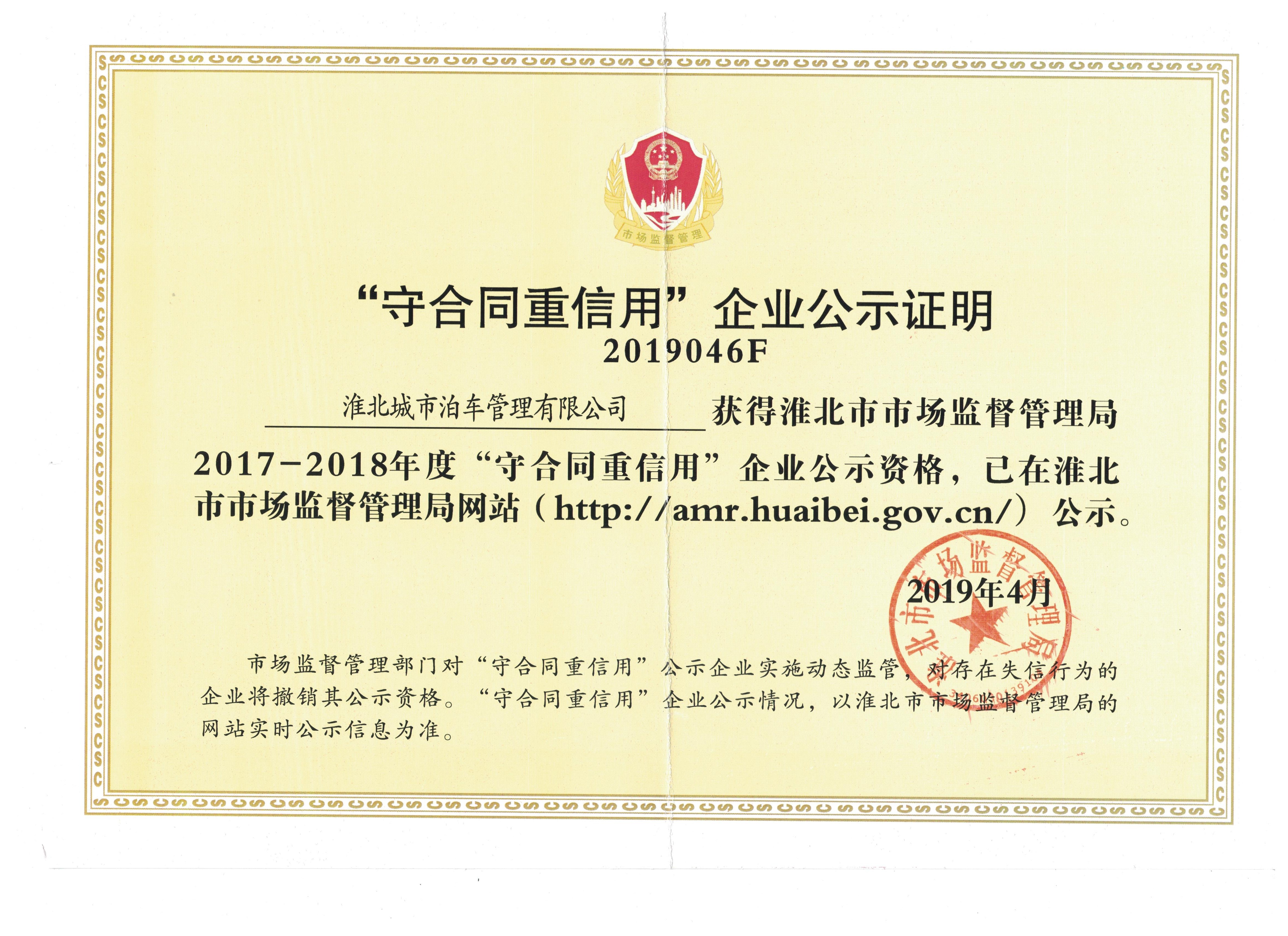 城泊公司被評為淮北市2017-2018年度“守合同重信用”企業(yè)